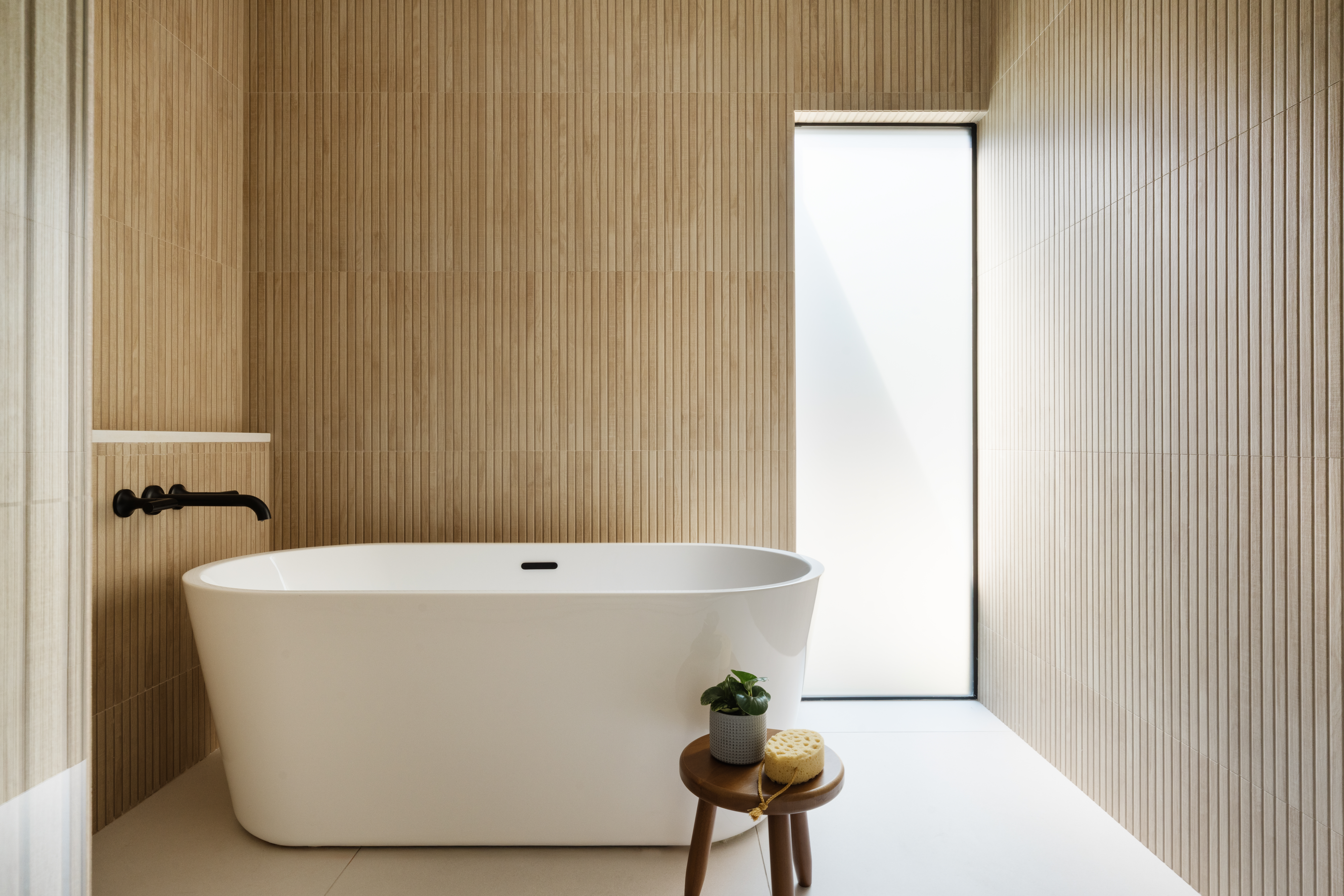 LIVING ROOM: The living room also benefits from all the natural light coming in from the new windows. In addition, we installed a brand new fire box and an all new Fireclay Tile fireplace surround and hearth. “Floating stairs” continue the light and airy look up to the second floor, and we installed a Bona white oak herringbone wood floor over the entirety of the downstairs area.
