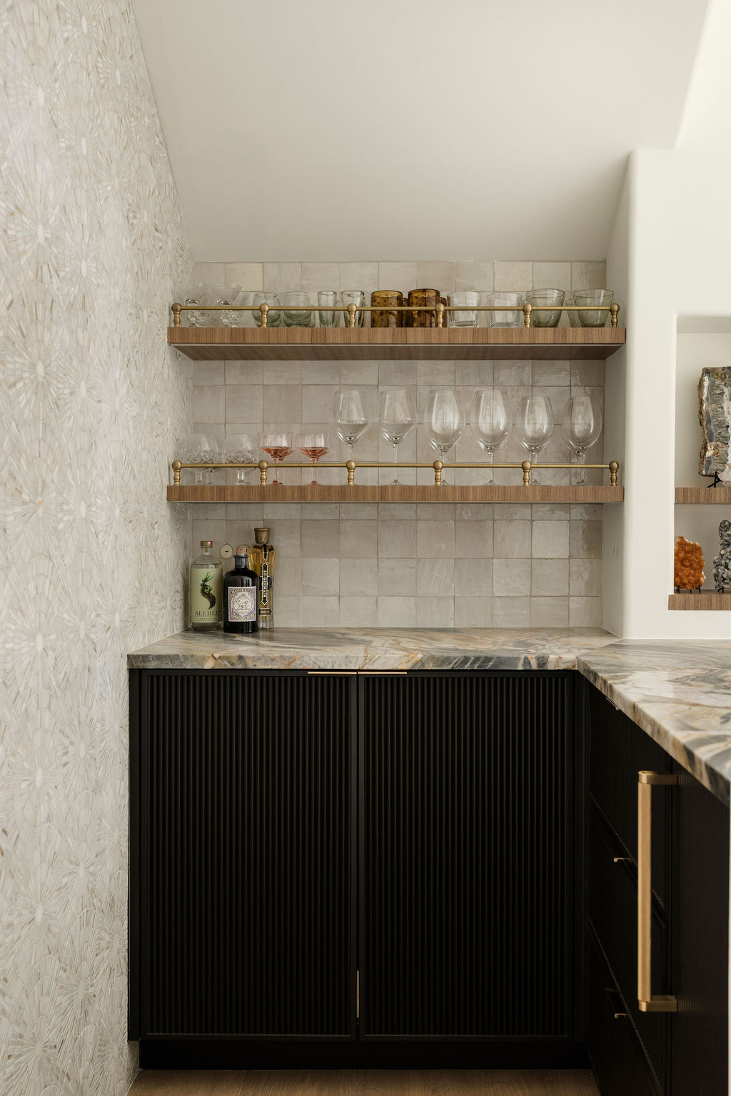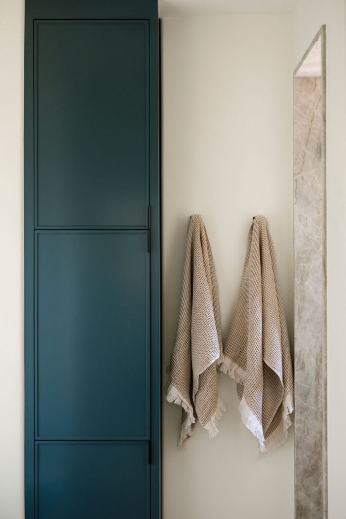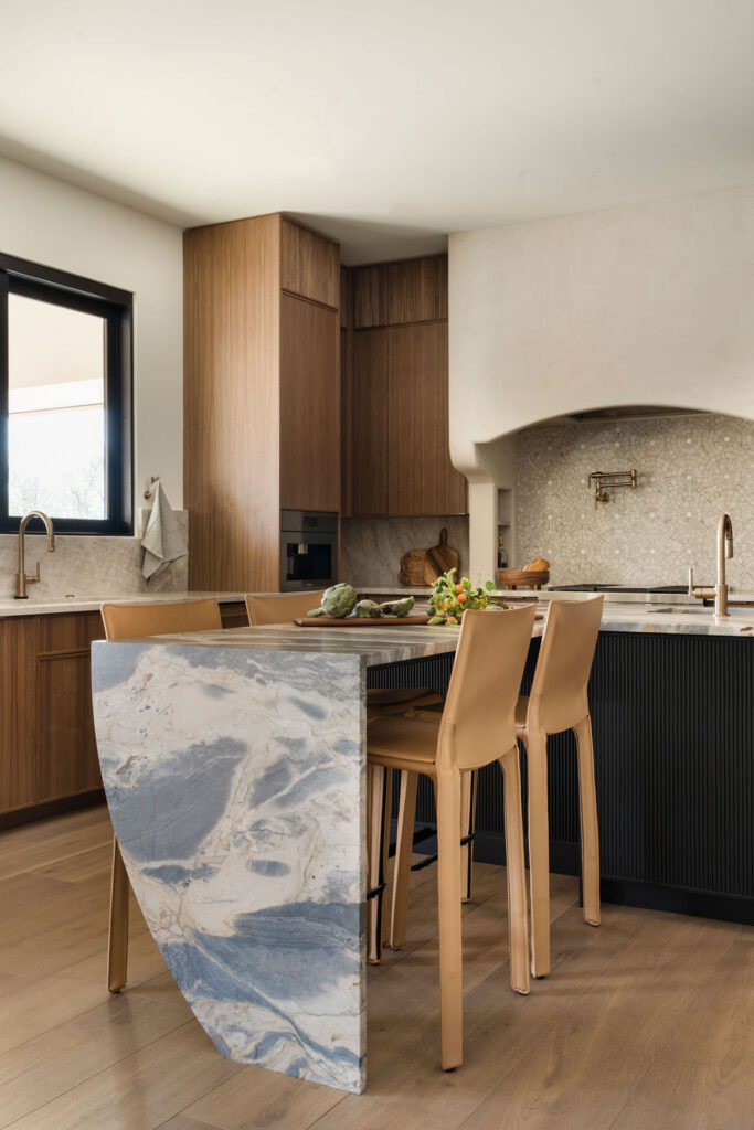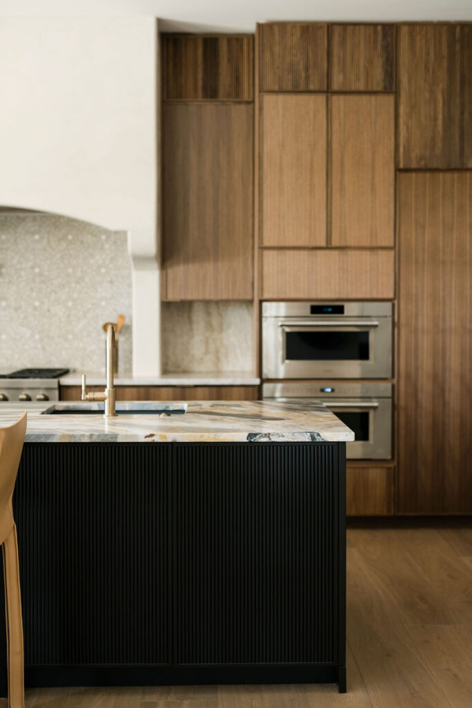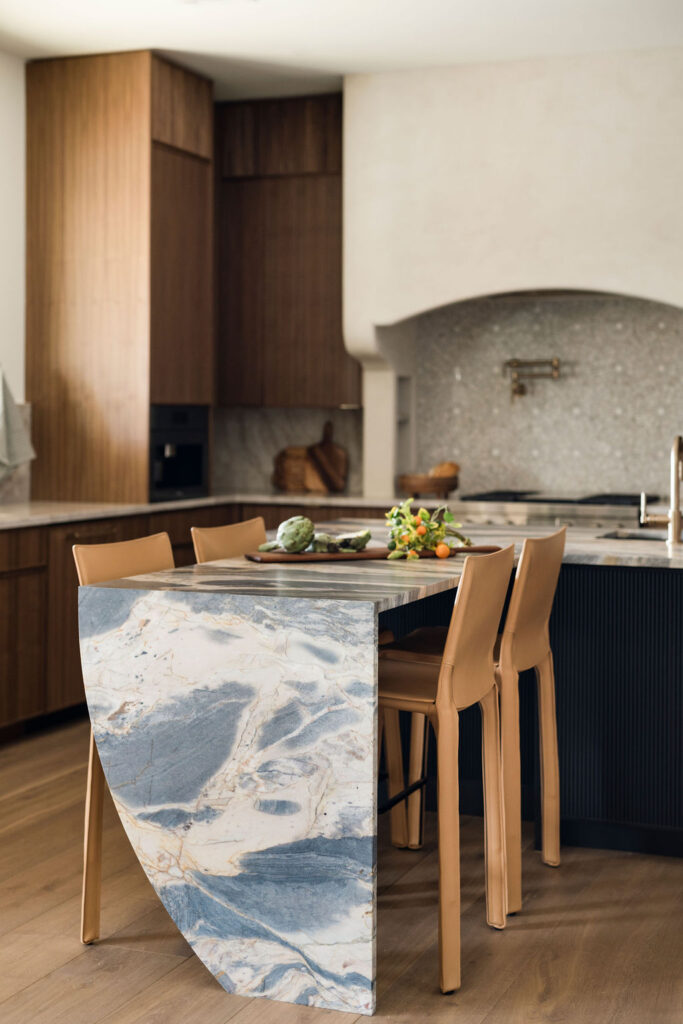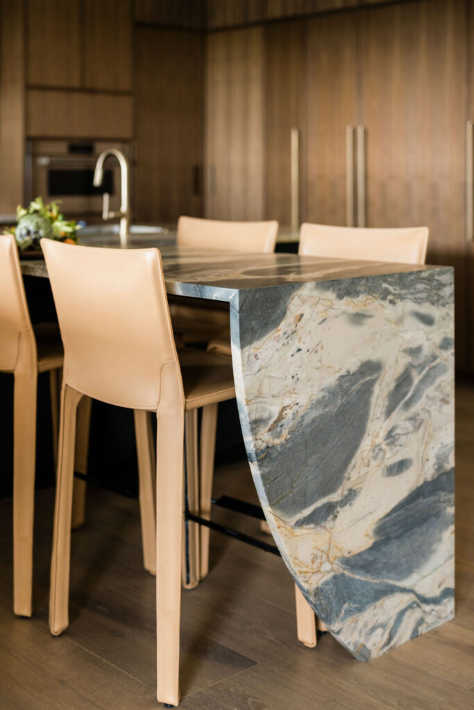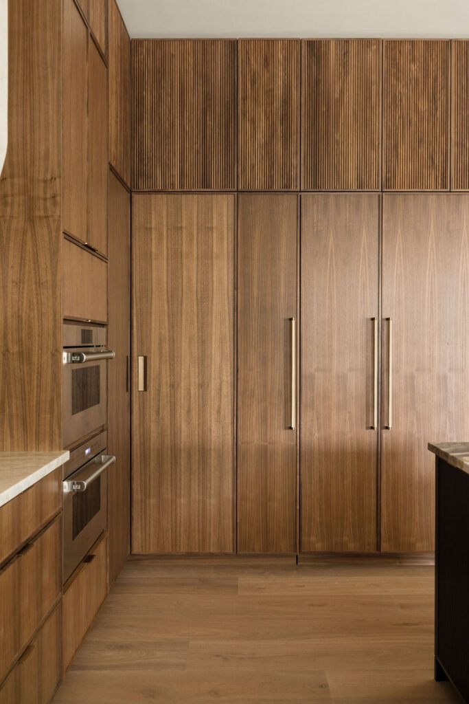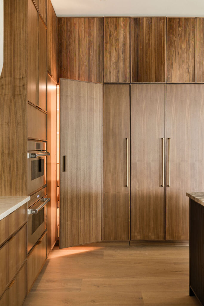 At the heart of the home is the kitchen, where our in-house custom millwork shop, Skelly Built, played a major role. Every cabinet was designed, built, and finished by our team, allowing the layout, proportions, and detailing to be fully tailored to the homeowners’ lifestyle. Floor-to-ceiling pantry walls, integrated appliance panels, and reeded island detailing give the space almost a furniture-like, architectural quality. The perimeter is wrapped in Taj Mahal quartzite with a soft leathered finish, while the island features Crystallo Ondulato quartzite, a material which was hand-selected by the homeowner for its exquisite beauty and quality.