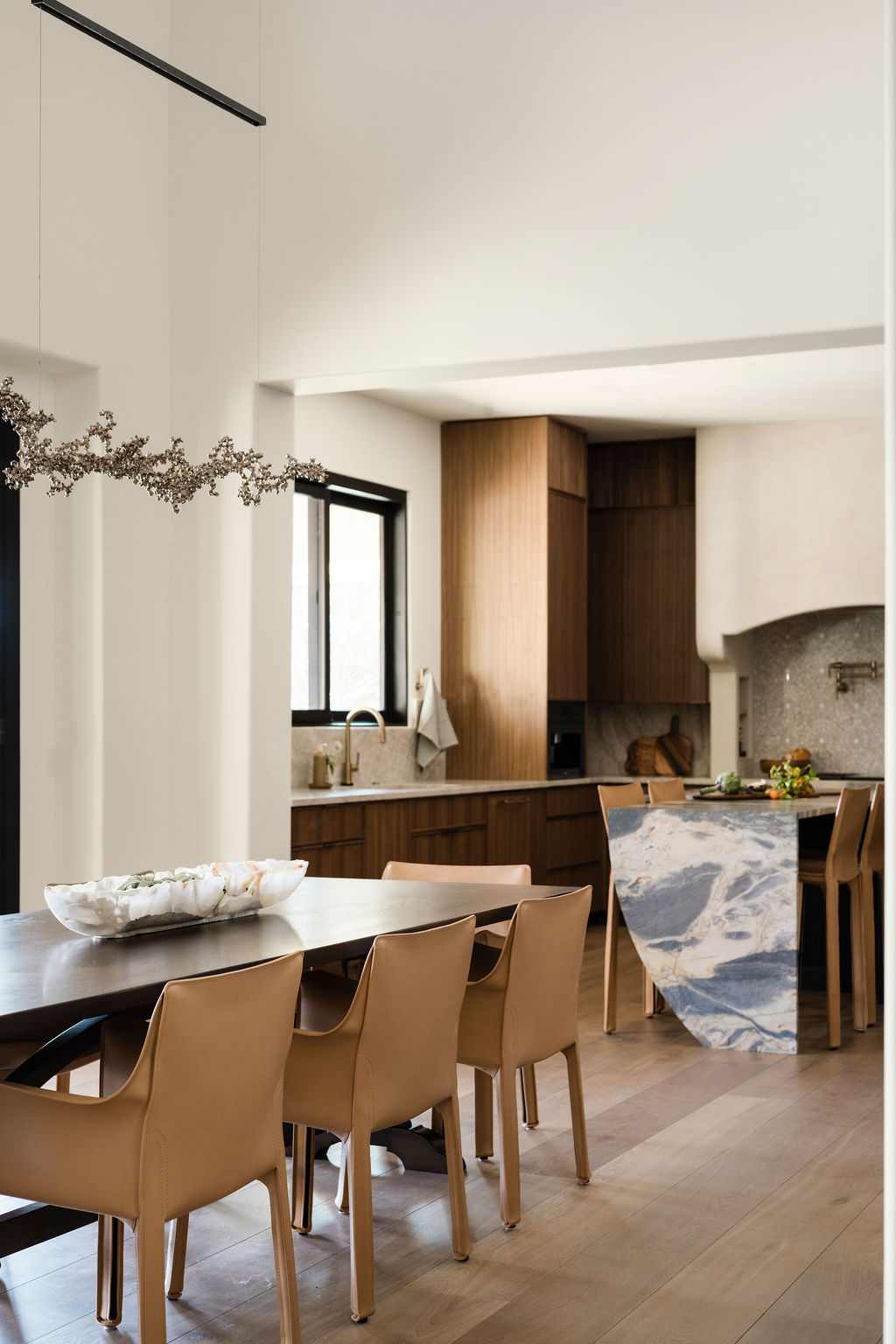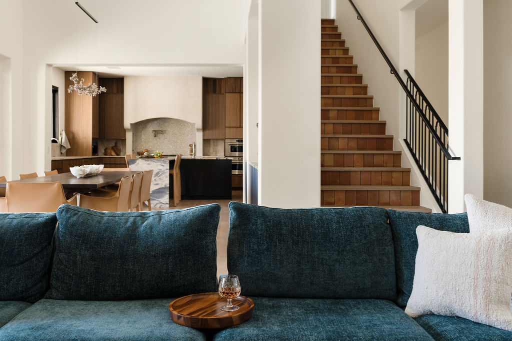 From the start, the goal for our Spanish Oaks Residence renovation was clear: lean into modern Mediterranean vibes, layer in natural tones and crystals, and create a home that feels like organic luxury without taking itself too seriously. And, as serious University of Texas fans, the more burnt orange hues that were incorporated into the design, the better!