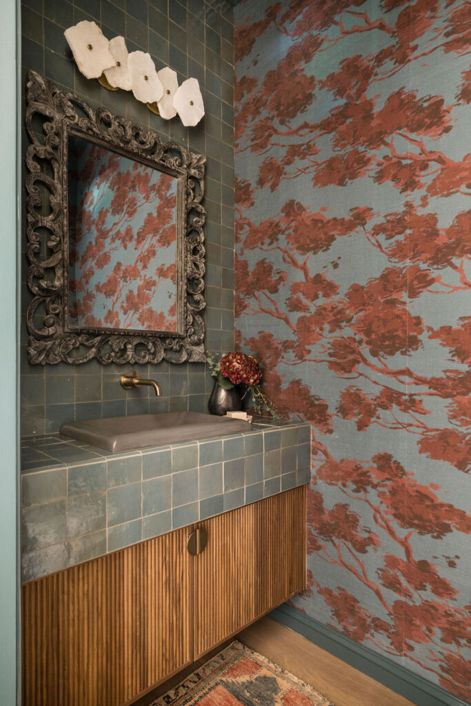 The staircase became a major architectural feature of the renovation. The risers are finished in custom Saltillo terracotta tile, adding texture and subtle pattern, while updated railings and finishes tie the vertical circulation seamlessly into the home’s Mediterranean aesthetic. Flooring transitions throughout the house were carefully considered, balancing stone and wood for both durability and warmth. A fun powder bathroom on the main level also adds warmth and charm through the creative use of wallpaper, custom cabinetry, tile and wood.