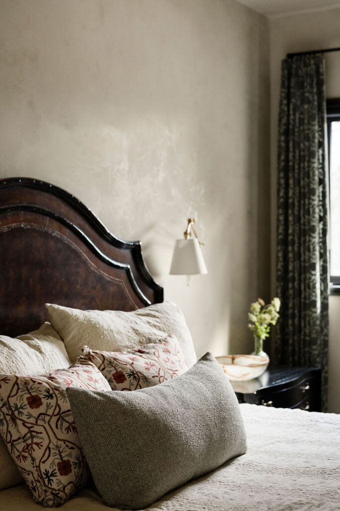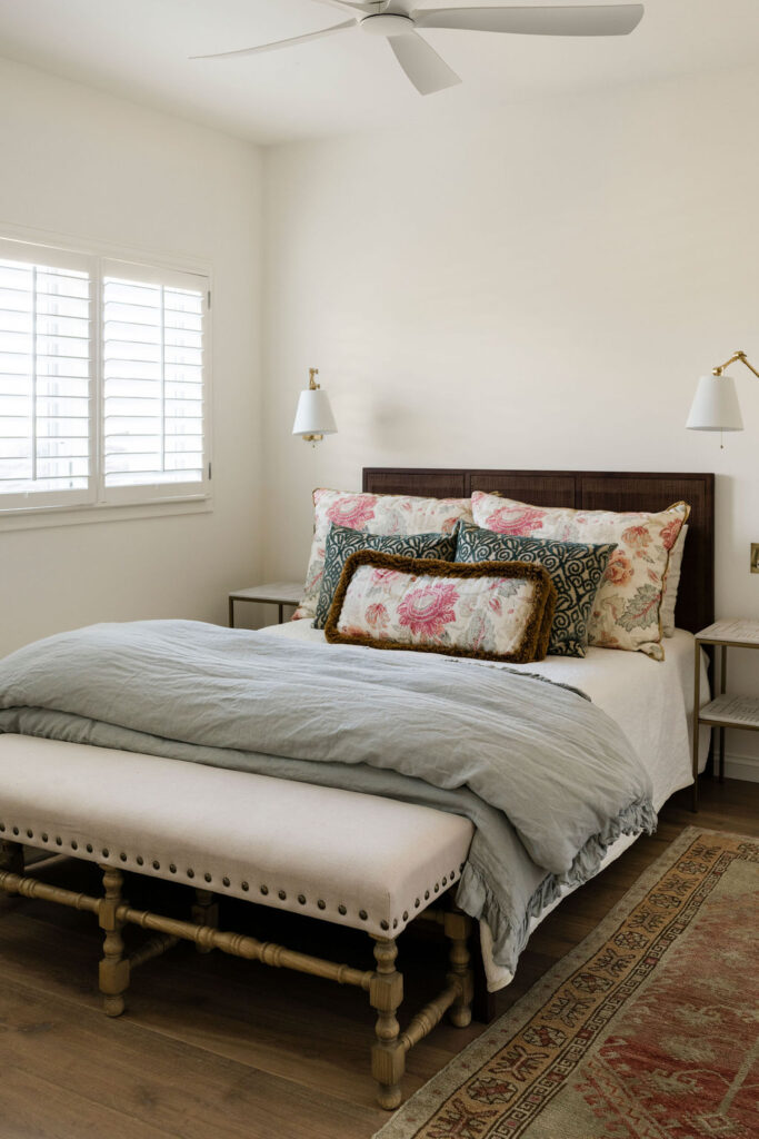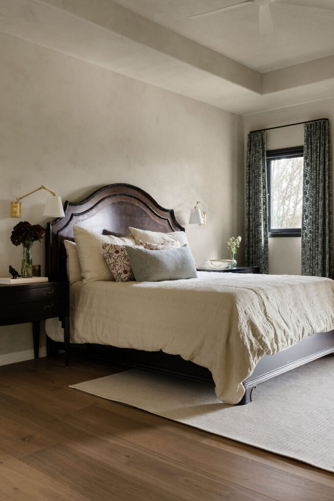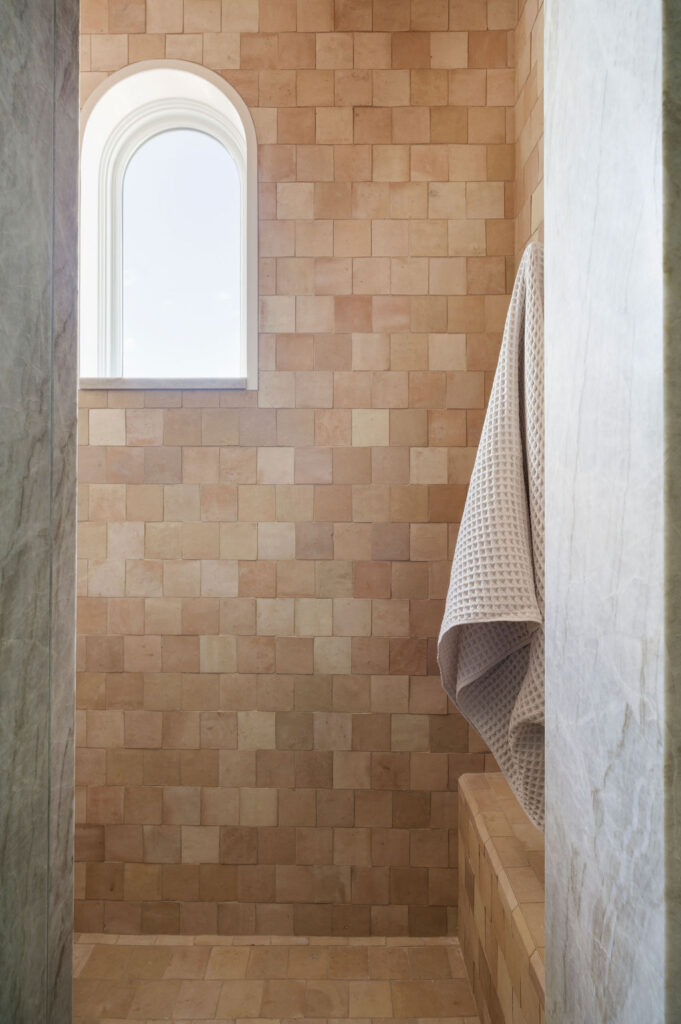 The primary suite was designed as a true retreat. The primary bathroom continues the Med spa narrative, with floors and shower finished in custom Saltillo terracotta tile laid in a Riviera pattern, paired with honed Essential Gray marble on the walls and vanities. Wall-mounted Brizo faucets in luxe gold, an oversized walk-in shower with a 42-inch linear drain, and sculptural Arteriors pendant lighting create a space that feels more like a boutique hotel than a residential bathroom!