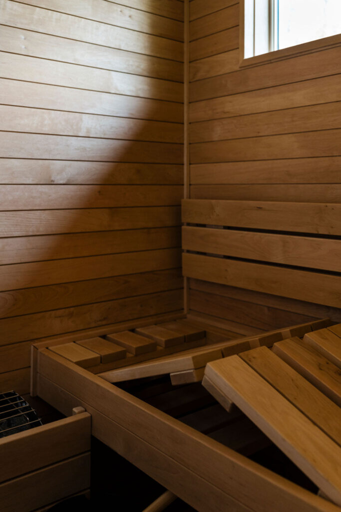 Directly off the primary bathroom is the custom sauna, forming a private wellness zone within the homeowner’s suite. Warm wood interiors, moody lighting, and minimalist detailing create a grounding, restorative environment—an intentional extension of the spa experience.