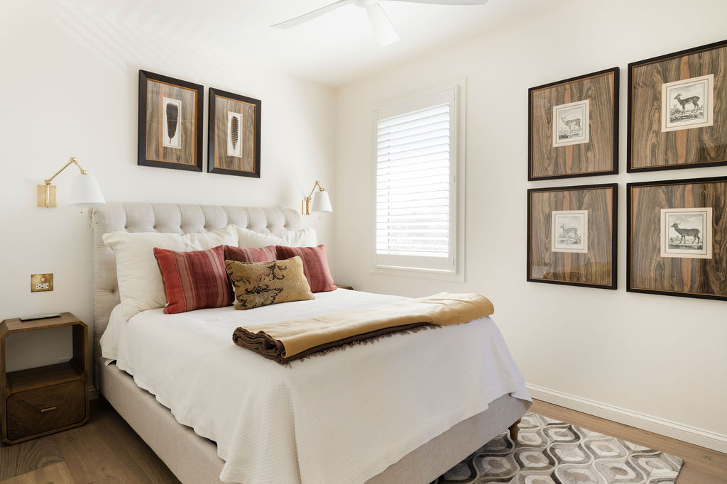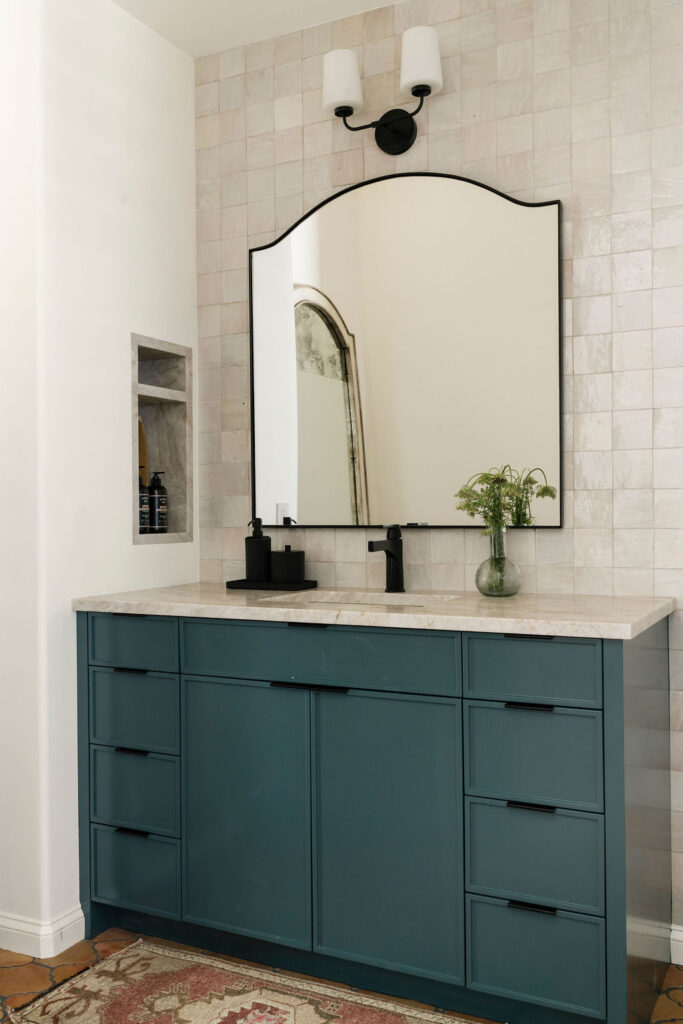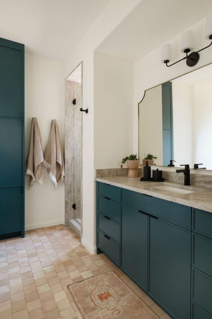 Upstairs, we reworked secondary bedrooms and living spaces with new flooring, lighting, and custom storage solutions, creating rooms that feel elevated but livable. Built-ins, closets, and niche cabinetry throughout the home were fabricated by our millwork team, ensuring consistent quality and detailing across every space. Guest and secondary bathrooms carry the same design language, featuring zellige tile, layered stone selections, and warm metallic fixtures that reinforce the home’s cohesive, Mediterranean-inspired palette.
